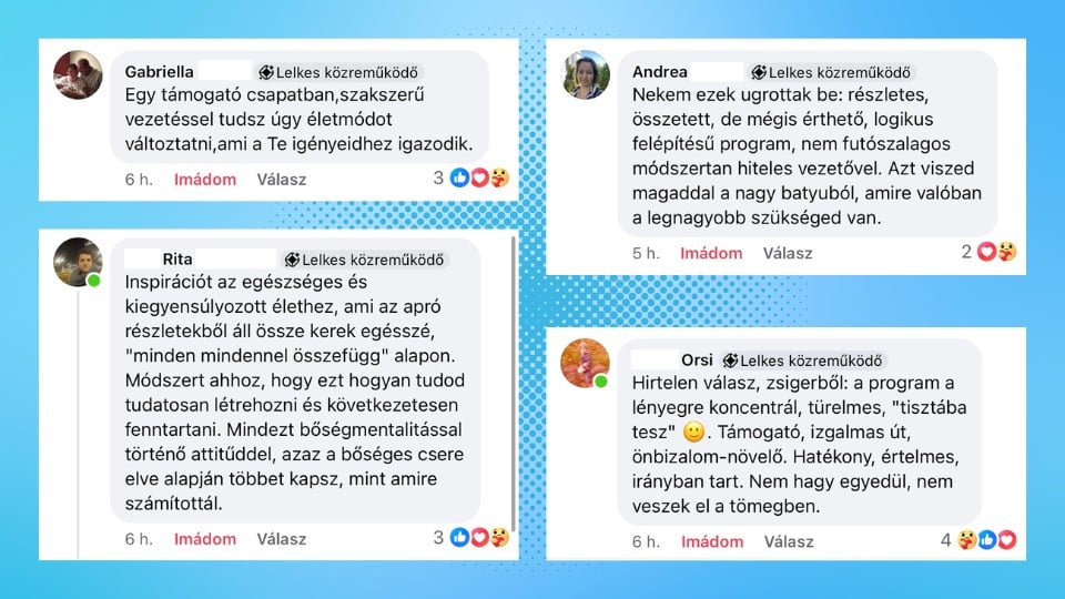 A program során végig egymást támogatva, közös erővel haladunk a célok felé. Biztos lehetsz benne, hogy a résztvevők mind kedves, támogató és elfogadó emberek, ezért is tartok mindenkivel egy konzultációs beszélgetést a jelentkezéskor.