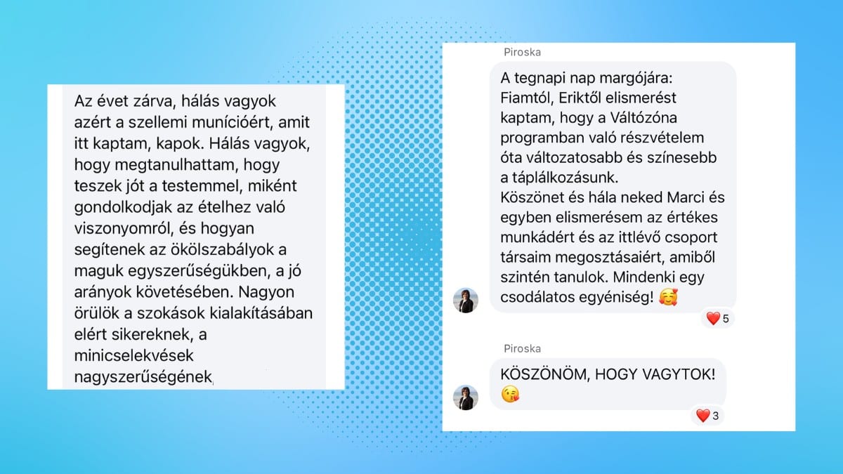 „Nagyon sok mindenben megváltoztatott. A motiváció, az elősegítés, meg rengeteg új élelmiszert ismertem meg, amit azóta is szeretek, főzök, használok.