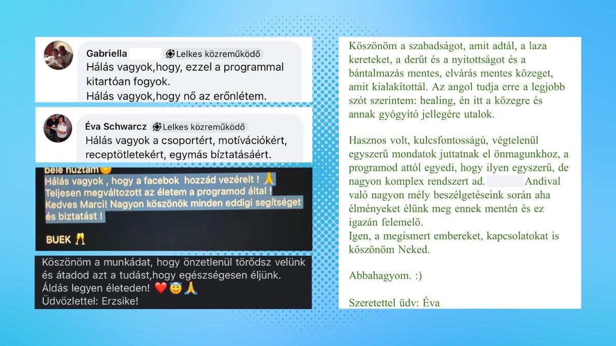 „Meg kell hogy mondjam, hogy egyetlenegy fillérét sem bántam meg! Egészben szemléltél minket. Végre éreztem azt, hogy nem orvosra van szükségem, hanem emberre, aki engem komplex egészként képes kezelni, és erre ad nekem tanácsot, hogy hogyan fejleszthetem ezt a komplex egész lényt, aki én vagyok magam, és ez nekem nagyon bejött!”